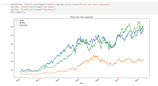 En este artículo la fuente de datos se usará la librería de Quandl directamente. La idea es obtener los precios de mercado de 3 Aerolineas (Delta con código DAL, Jet Blue con código JBLU y Southwest con código LUV). Se gráfica el historico de los precios de cierre, el volumen de ventas y movimientos promedios de estas tres aerolineas.